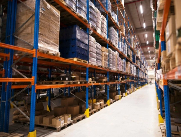 A warehouse setting showcasing Dravin International's selected industrial commodities, including steel components and textile raw materials, highlighting the reliability and quality of the products.
